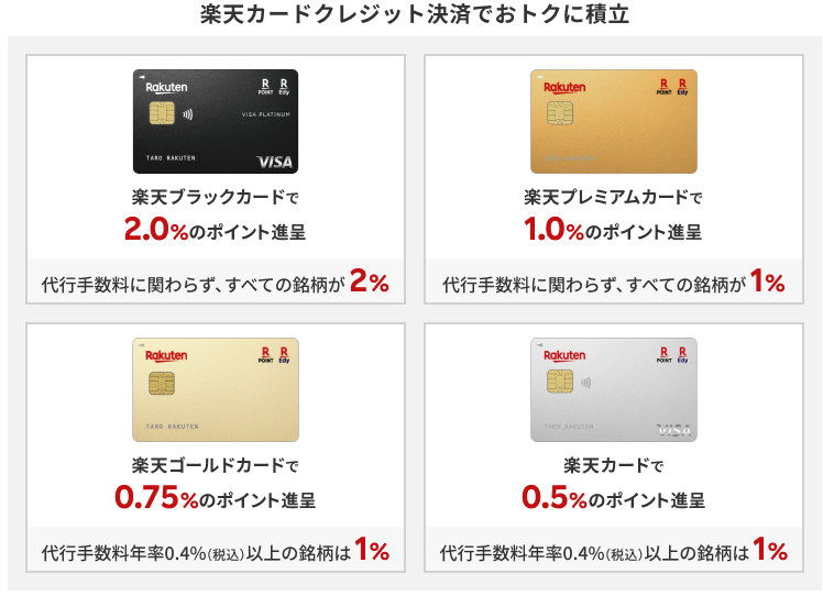楽天証券×楽天プレミアムカードでのクレカ積立ルートで1%還元ルートを目指しましょう。