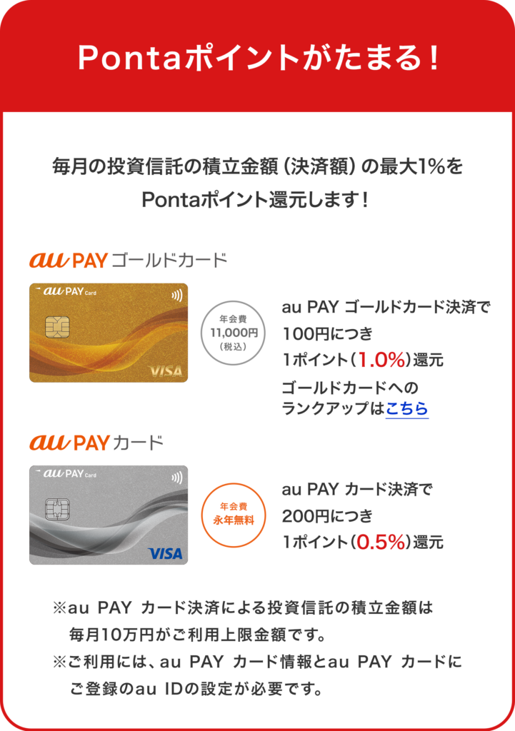 こちらも毎月10万円までクレカ積立ができます。pontaポイントでの還元となります。