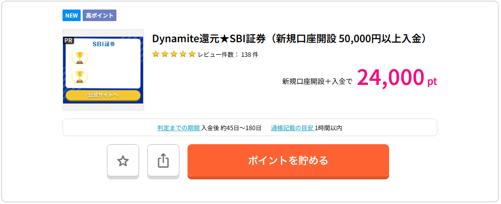 2026年2月現在でSBI証券の口座をハピタス経由で口座開設をすると24,000ptためることができます。ただし、対象期間中に「SBI証券」の証券総合口座から「住信SBIネット銀行」のSBIハイブリッド預金へ、一括で50,000円以上の振替をされた方が対象となっています。