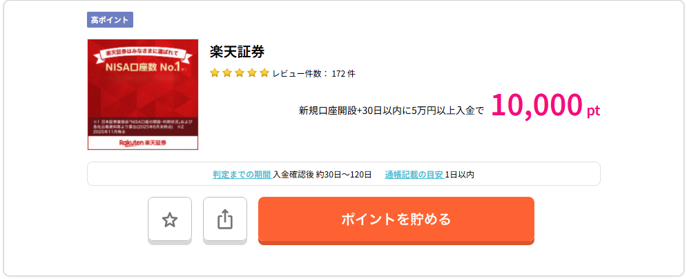 ただしこちらも条件があり、総合取引口座開設完了後、30日以内に楽天証券口座へ5万円以上の入金完了のことです。証券を買う必要はありませんので、判定日までに楽天証券へ振込するだけで良いです。楽天銀行から送金すれば手数料がかかりませんので合わせて楽天銀行もポイントサイト経由で解説することをお勧めします。