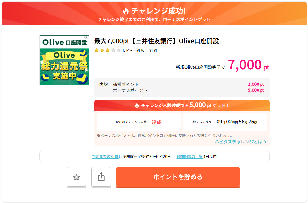 7000ptがもらえます。新規Olive口座開設完了がポイント有効判定となります。