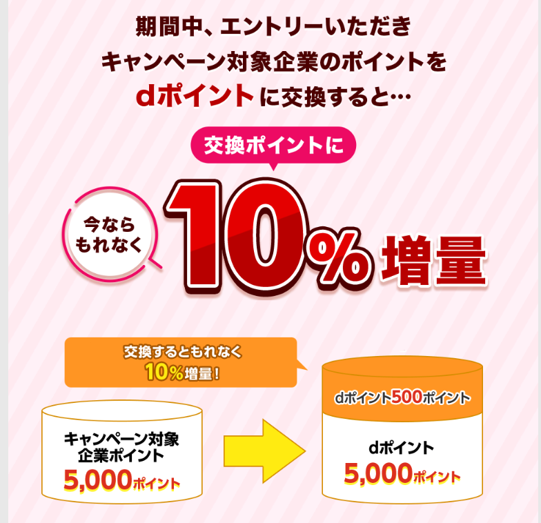 キャンペーン対処企業ポイントをdポイントに交換するだけ、なんと10%増量キャンペーンとなっています😲