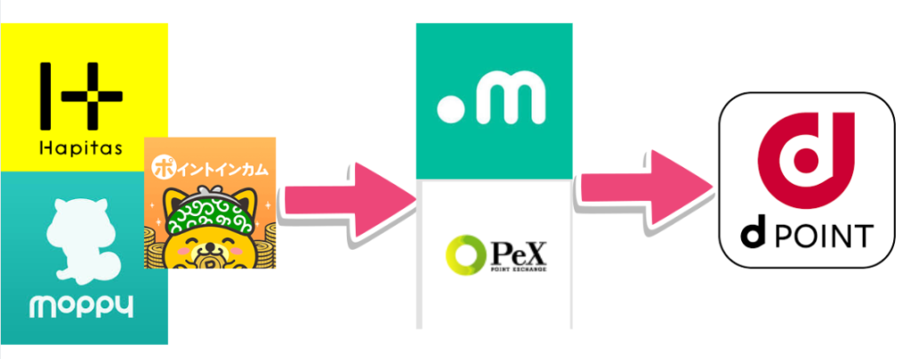 ポイントサイトでためたポイントを.moneyやPeXなどに交換すればdポイント10%増量キャンペーンの対象となります。くれぐれも、ポイントサイトから直で交換しないようにしましょう。